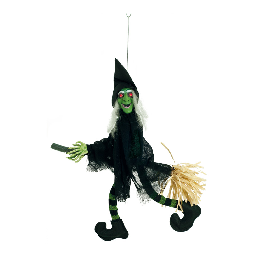 Hexe auf Besen, 70x45cm, bewegliche Beine, spricht+lacht, Augen blinken rot, 3x AA Batterien (nicht inkl.)