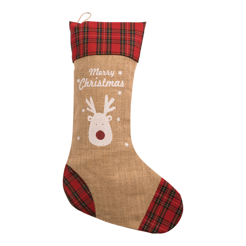 Produktinformationen "Jute-Weihnachtsstrumpf, 52x20cm Rudolph Merry Christmas, bedruckt, mit Hänger"