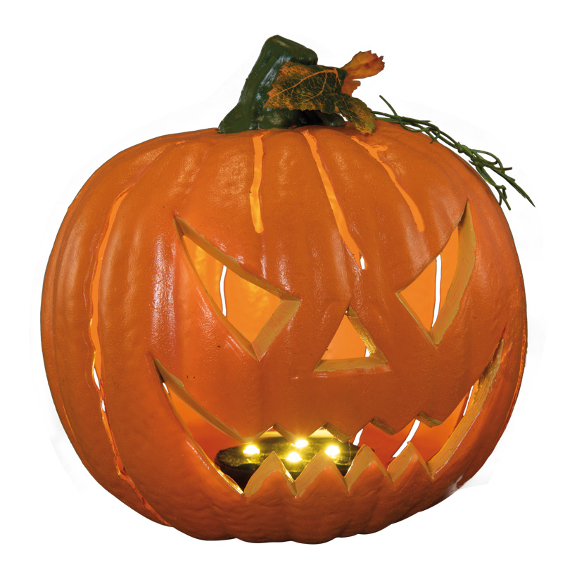 Kürbis mit gruseliger Fratze, 25x20cm mit 2 Programmen, Standlicht und blinkendes Licht, aus Kunststoff, batteriebetrieben, 3x AAA, nicht inklusive